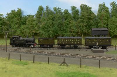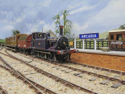 Arcadia is fictitious but inspired by the 1900 Rother Valley Railway, later the KESR. Stock is from parts supplied by the S Scale Society, from etches or 3D prints and with some items scratch built. With the carriage and locomotive sheds accessed from the fiddle yard, the visible section is just over 4 feet.