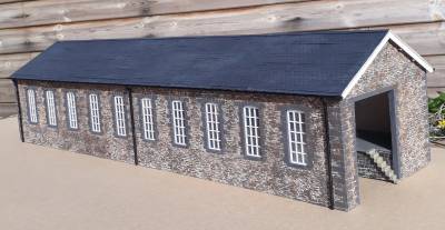 The goods shed has been built for my ‘O’ gauge layout and is based on the shed at Ilfracombe. It is somewhat shorter but is still over 700mm long. All sides and roof are cut on the club’s laser cutter from thin MDF using a stone wall pattern manipulated on the computer to get the right size and shape of stones. The quoins were cut separately and glued in place. Filler masked the gaps. It was painted a stone colour using emulsion and then dry brushed with greys and rust coloured enamels. The roof is removable, with finely cut trusses, glued to an MDF flat surface and covered in paper cut into rows of slates. Guttering is from an umbrella found at a tip!! The windows are cut from white Rowmark plastic, two pieces being used to sandwich a layer of clear acrylic. There is an interior platform and a white metal crane.