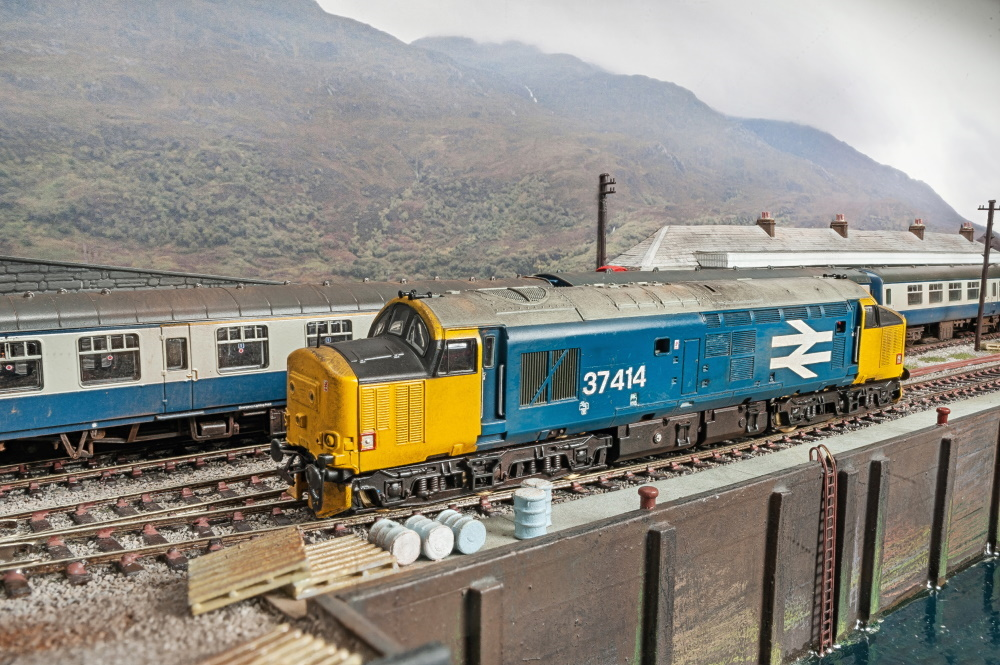 The layout era begins late 70’s to capture the overlap between class 24’s and class 26’s with the gradual replacement by class 37/4’s. The rolling stock modelled, all being visitors to Kyle, are primarily ready to run models, which have been detailed and the wheels reprofiled to 2mmFS standards. Over time, chassis are gradually being replaced with 2mmFS etches.