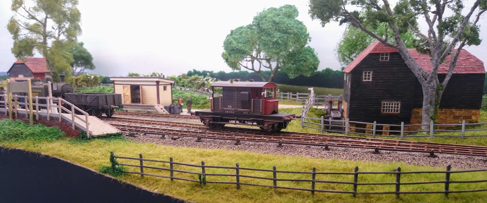 A particular interest was to build models of the watermill and mill cottage. The original buildings were at Tablehurst Farm in Forest Row (near East Grinstead). The mill was demolished in 1933 but the cottage still exists. The coal office is a typical LBSCR goods lock-up and the station building is a reduced version of those found on the Kent and East Sussex Railway. The railway runs in two periods; Southern Railway in the early 1930s and the pre-grouping era when trains from both the LBSCR and SECR may be seen.