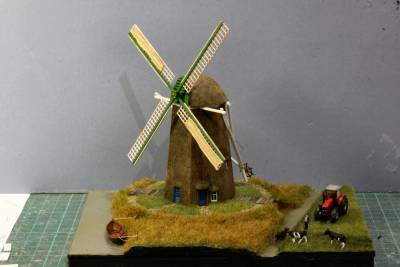 N Gauge, 1:160. Built on an A5 ply base using 2mm card and clear plastic. The water is painted on the underside with a mix of grey and green with the ripples made from Mod Podge blown around with a straw. Some areas of water have been tinted with Games Workshop washes; around the cow it is a browner colour to represent the mud being stirred up. Figures by Preiser, tractor by Wiking, the wood planking is from coffee stirrers and the paths are Slaters stone sheet. Different lengths and colours of Static grass have been used to denote the different areas of grass, the rowing boat is from an Artitec kit (painted with acrylics). Ropes are from rigging cord soaked in dilute PVA so they keep their shape. Can the farmer get the stupid cow out of the water?