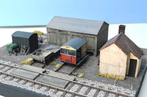 This is an N Brass etched kit for the Wickham Trolley. The buildings are scratchbuilt with the mess hut being probably 50 years old and built as a teenager. The bricks are computer chads (slightly over scale but rather fun). The corrugated hut has a laser cut core and window and is covered with corrugated aluminium foil. The other bits are mainly from Coopercraft. It has the requisite water (a puddle under the tap), greenery (weeds), hard landscaping (ballast and brick chimney).