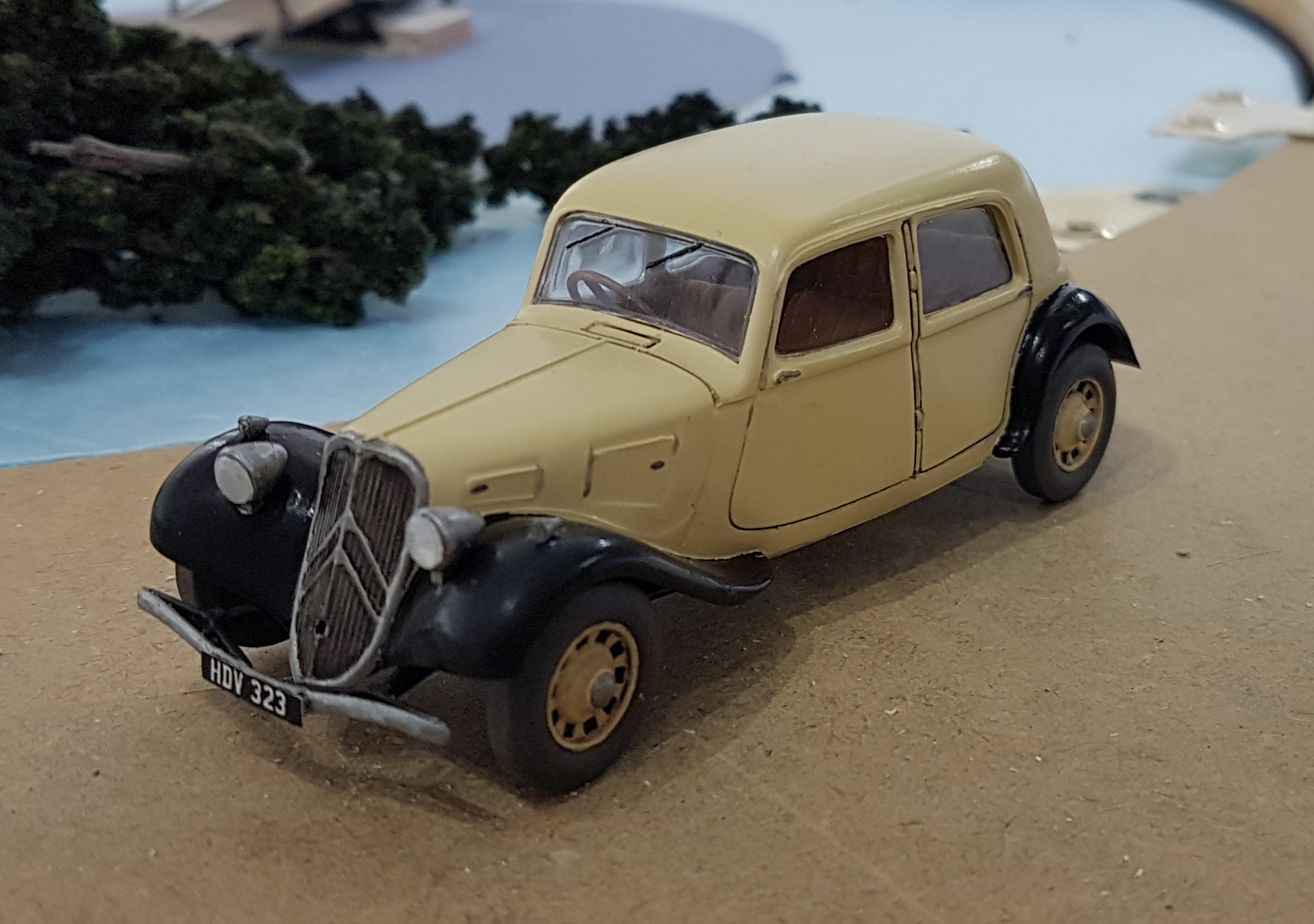 O Gauge, 1:43. A plastic Heller kit which I have converted to right hand drive. The dashboard has been reversed and detailed using a photo, fuel filler and number plate have swapped sides. Painted in acrylics. Fitted with home-made Devon numbers plate for Okehampton. The prototype would have been built in Slough.