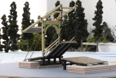 N Gauge, 1:160. A scratchbuilt Dutch lift bridge made from plastic strip and brass wire based on those at Arnhem Open Air Museum. The side rails are hinged and connected to fine chain which in turn is connected to the main lift chains. The bridge is balanced with a small piece of lead and will open if required and can be posed in any position. It is 42mm high from the bridge deck. It does not have an operating rope as the prototype does not have one, presumably to stop visitors opening the bridge.