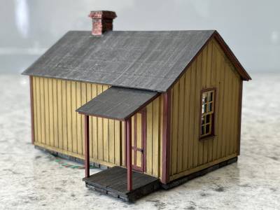 The HO scale model is scratchbuilt in styrene using Evergreen sheet stock, and Wills stone for the foundation. The door and double-pane windows are all scratchbuilt too. The porch floor is wood. The roof is correctly planked on the underside with a tissue covering to represent tar paper. The chimney was hand-laid from individual Juweela HO bricks to the RGS style. There are lights inside that represent an oil lamp on a table and a small fire in the grate.