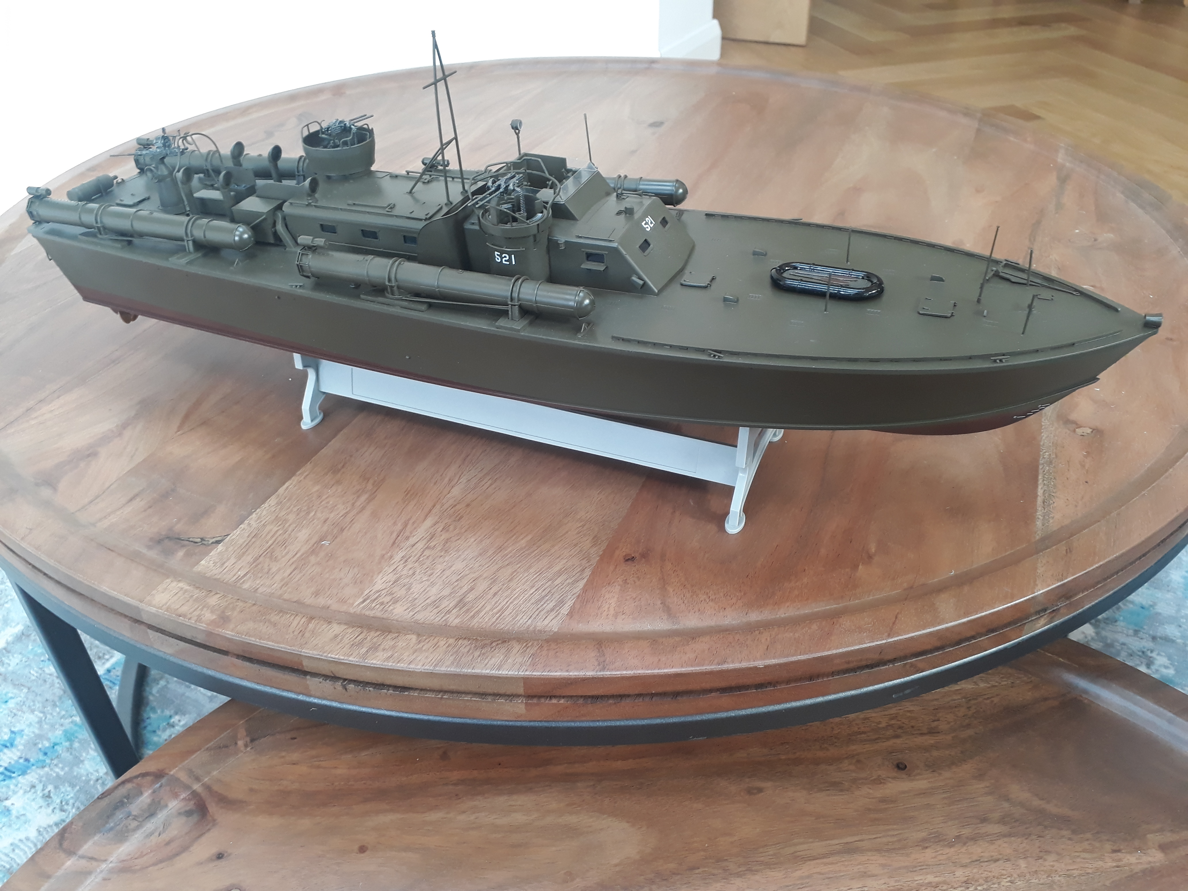 A US PT torpedo motor boat as used in the D-Day landings. A Merit 1/48 scale model which will sit in the dockside on the layout.