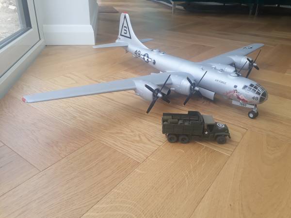 A B29 bomber as used mainly in the Pacific war. This is a 1/48 scale model which has a 3 foot wingspan, and full internal detail which you can't see once the fuselage is glued together!