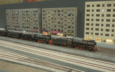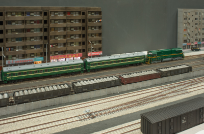 This layout was inspired by my many trips to China from 1993 to 2015 to photograph the last of Chinese steam. The layout is set in 2001 and, by then, the remaining steam action was mainly centred around heavily polluted industrial cities in the north of China and Beijiao is a fictitious version of such a city – in many ways the real China, the China which few tourists ever see. There are three distinct systems on display. Firstly, at the back of the layout we have an industrial railway linking coal mines off stage to the left with a steelworks off stage to the right. Access to the steelworks is up a 1/30 grade and so uphill trains require the help of two bankers on this section. There is also a passenger service for the steelworks workers, many of whom live in the drab tenements around the station.