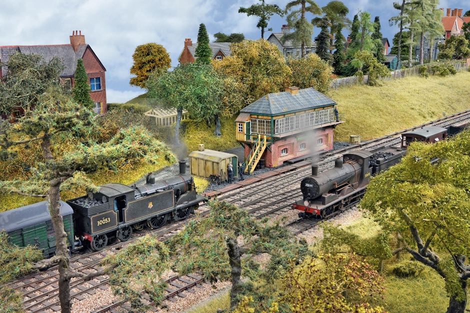 Above: The daily pick up goods, hauled by a Drummond ‘700’ 0-6-0, arrives on the goods line opposite the signalbox as an ‘M7’ 0-4-4T departs. The box is an exact replica of the one at Bournemouth West and features a full interior.
