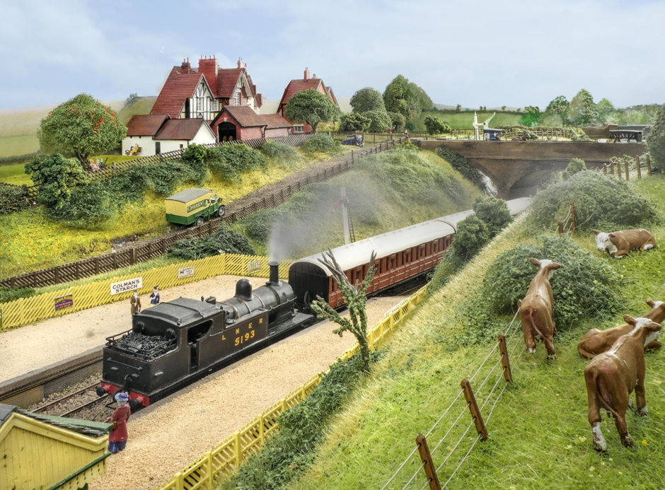 Above: LNER Robinson ‘C13’ 4-4-2T 5193 approaches Wendover with a Marylebone-Aylesbury stopping train. Note the Hereford cows in the foreground to suit the period of the layout.