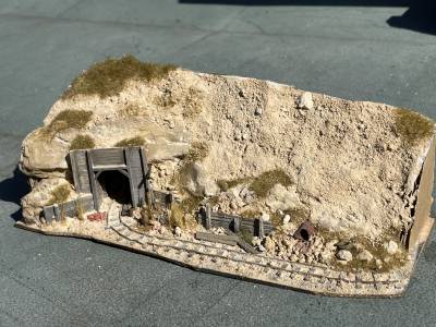 This freelance scene was built ultimately to be added to my layout. It has a corrugated card under structure covered with white glued issues, and then real dirt from Ardley Quarry and from Colorado. The trackage is bits of whitemetal track from I can’t remember where, and the mine adit itself is all wood, heaviliy weathered and distressed. Note the roof has collapsed just inside. Vegetation is Woodland Scenics static grass and other products, and the snake and rabbits are from Miniprints.ca.