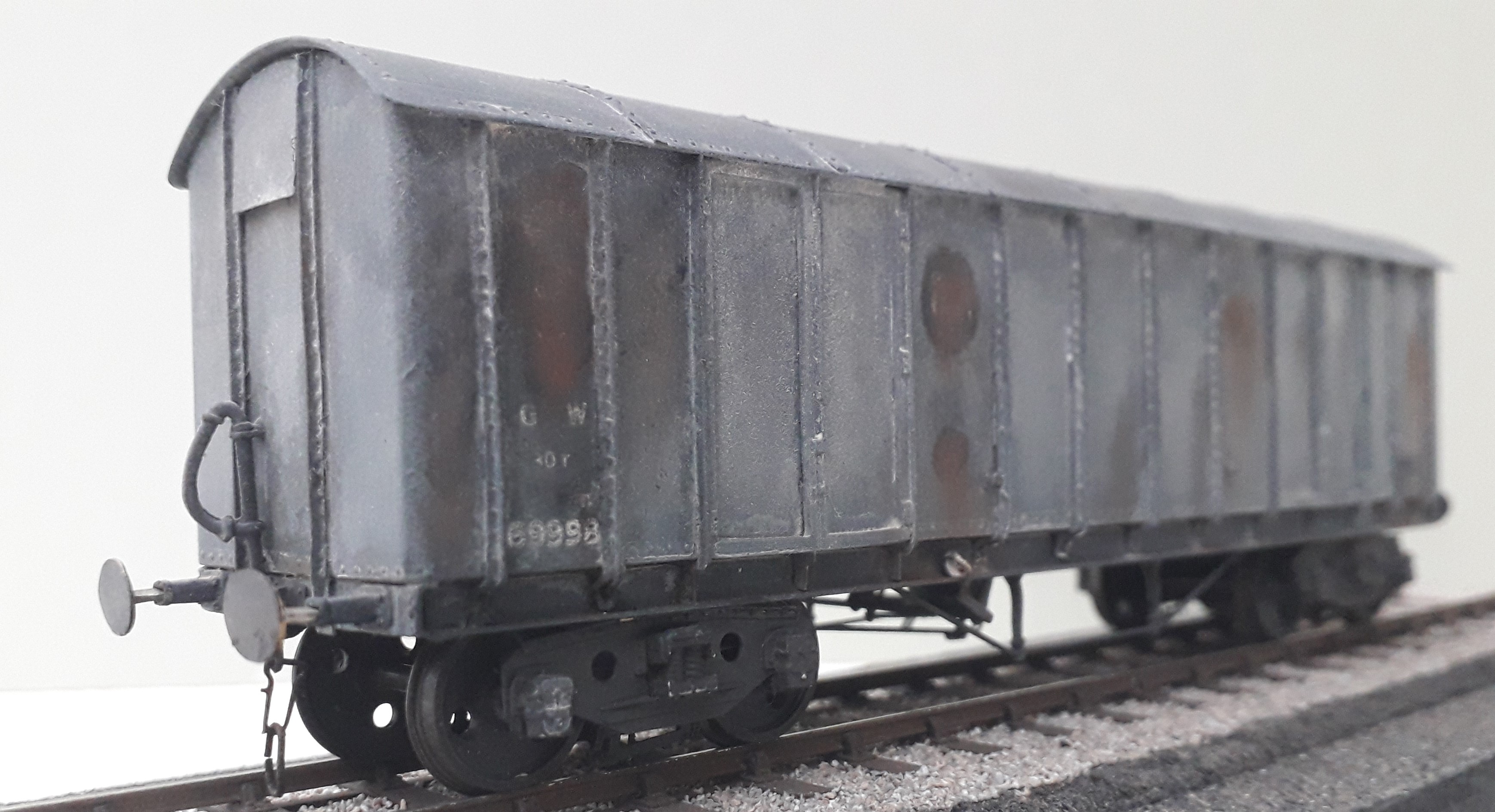 This is a very old Hobbies Kit made from pressed aluminium and whitemetal castings for the strapping. Getting everything glued up was a challenge! I have added some finer details e.g., vac cylinders from Frogmoor Confederacy and Rumney bogies. It is in service in early BR days and still carries very worn GW livery with some evidence of an even earlier livery. Inspiration taken from the early Russell book.