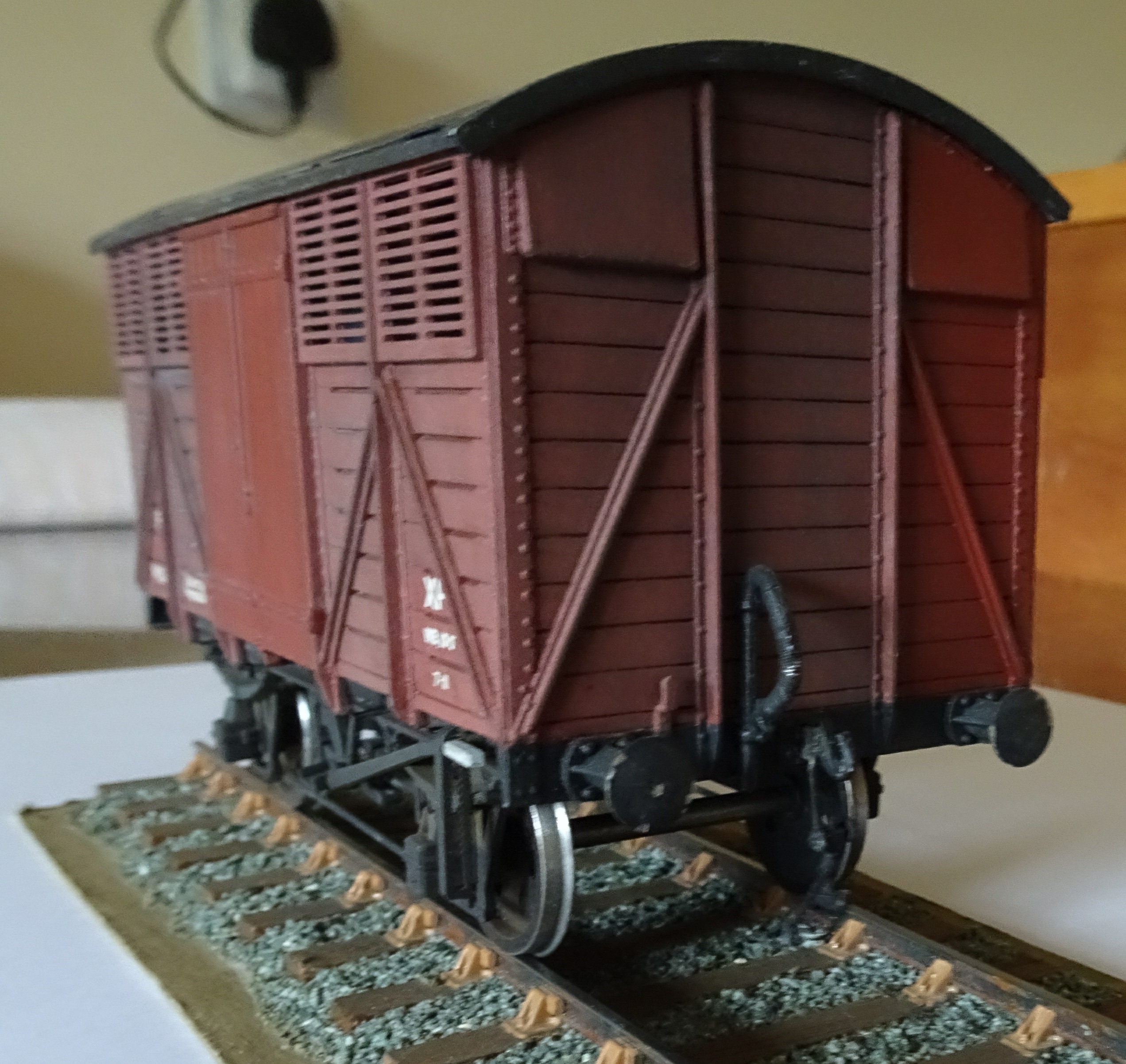 This modified Diagram 1/260 7mm 9’ wheelbase BR Gunpowder van is basically the Parkside kit (PS112) built as supplied but modified to add vacuum brake as some were early in 1960s. It was then repainted into bauxite reflecting the vacuum braked van. It has been weathered using suitable photographs.